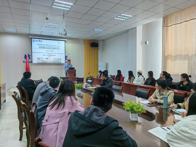 陈超余博士从智能纺织品的概念出发,讲述了其基于近年来新发明摩擦纳米发电机和摩擦发电机的工作原理,以传统纺织材料为媒介,有机的结合摩擦发电机高输出性能和工作模式适应性极丰富的特性,以及纺织材料的柔软舒适可穿戴性等各自的优点,制备具有能量收集和多功能自驱动传感功能的智能可穿戴纺织品的过程,从纱线的选择与制备,到织物结构的设计与成型,从织物结构的优化到产品实用的设计研究,陈超余博士都做出了细致的解读。最后,陈超余博士与有关老师进行了相关课题的交流。
