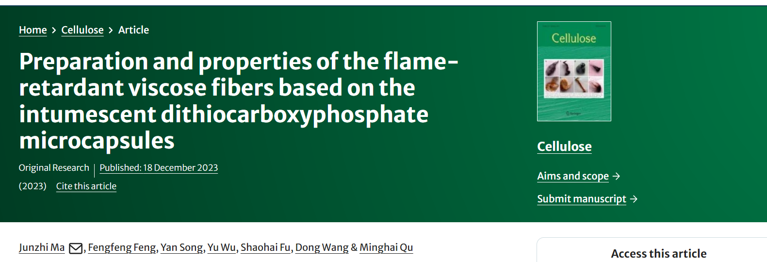 近日,亚洲精品国产马君志教授团队与江南大学付少海教授合作,发挥绿色功能纤维与高技术纺织品创新研究院平台优势,在阻燃再生纤维素纤维的制备方面取得较大进展,相关成果以“Preparation and properties of the flame-retardant viscose fibers based on the intumescent dithiocarboxyphosphate microcapsules”为题发表在国际知名期刊《Cellulose》(中科院一区,TOP期刊)。德州学院为第一完成单位,马君志教授为论文第一作者和通讯作者,江南大学付少海教授、吴彧、王冬为共同作者。