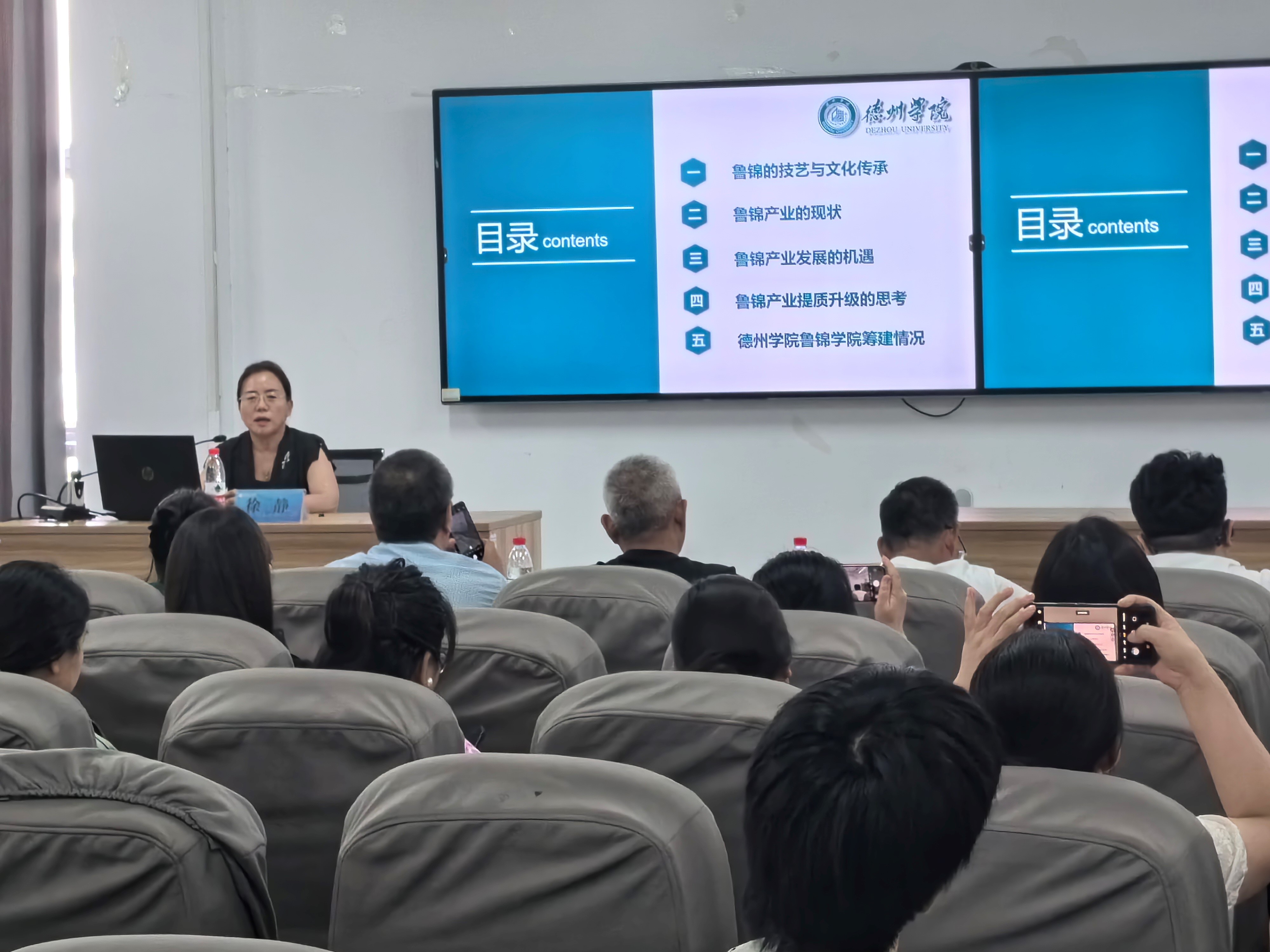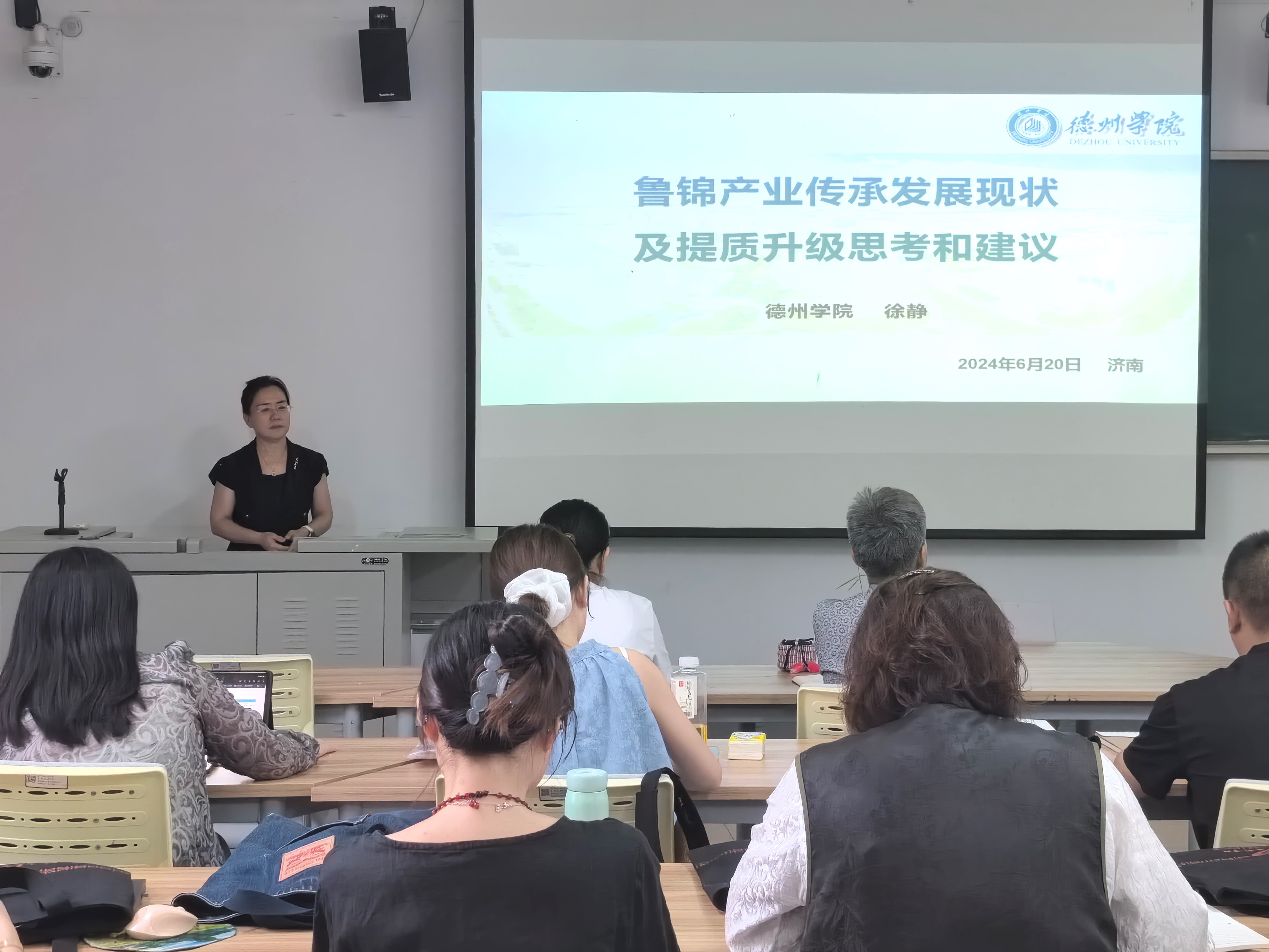 为深入贯彻落实省领导关于推动鲁锦产业高质量发展的指示精神,持续提升鲁锦传承人技能艺能,重塑鲁锦产业优势,加快产业创新发展,6月下旬,由工信厅主办的全省纺织服装产业数字化转型培训(鲁锦专题班)和文旅厅主办“中国非物质文化遗产传承人研修培训计划”鲁锦织造技艺研修班分别在济南开班。校党委委员、副校长徐静教授应邀在培训班上做专题讲座