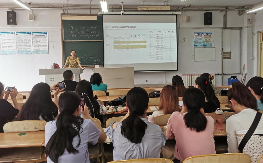 讲座中,我院教师针对如何择学校择专业、往届数据解析、报考程序、如何备考、如何制定学习计划等几个方面与同学们进行了深入探讨,用近三年我院考研数据向同学们分析了近年考研形势,明晰了报考专业门类并对相关专业进行了详细介绍,并重点讲解了考研复习规划及备考策略。