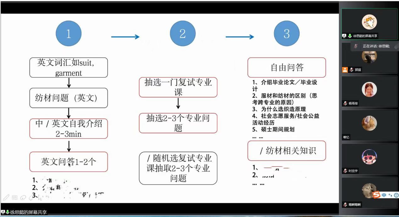 经验交流会按照工程和艺术两大类分别展开,来自天津工业大学纺织工程专业和武汉纺织大学艺术设计专业的两位研一学姐分别作为工科类和艺术类代表,分别分享了自己的复试准备工作、如何联系导师、如何制作个人简历、复试相关流程、面试心态调整等相关知识和经验,并为同学们分析了英语口语、专业课、综合问答等环节的常见问题及应对策略。来自南宁师范大学艺术设计专业的研一学姐,分享了自己在调剂院校上的经验及信息搜集渠道,为同学们分析了调剂过程中的注意事项,提醒大家注意关键的时间节点,把握好时机,全力以赴。经验分享过后,同学们就复试及调剂遇到的各种问题踊跃提问,学长学姐们均一一给予解答。