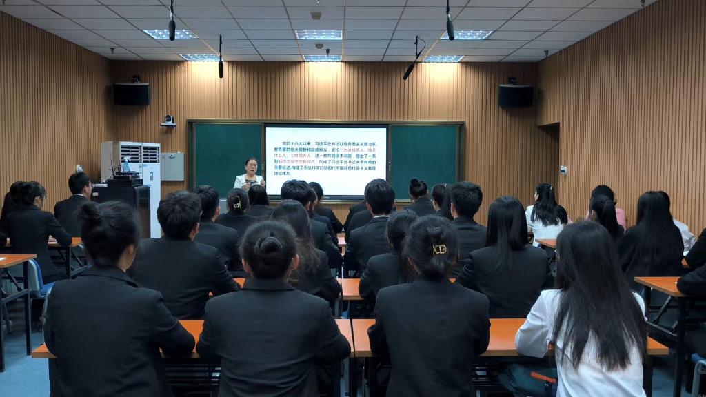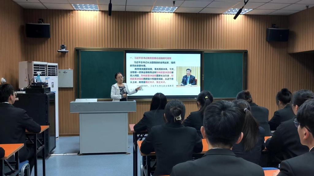 徐静以理论与事实相结合,围绕习近平总书记关于教育的重要论述和党的二十大精神,从“时代背景”、“战略意义”、“ 思想精髓”以及“时代使命”四个方面,对习近平总书记关于教育的重要论述作了系统宣讲和深入阐释。她结合学校以及学院发展、学生成长实际,对习近平总书记关于教育的重要论述的核心思想和精髓要义“九个坚持”进行了重点解读。课上她对青年学生提出了四个要求:一是坚定政治信仰,二是培养创新思维,三是发扬奋斗精神,四是锤炼过硬本领。她还勉励学生要善于创新,勇于创新,行胜于言,在服务基层、奉献国家中贡献青春力量。