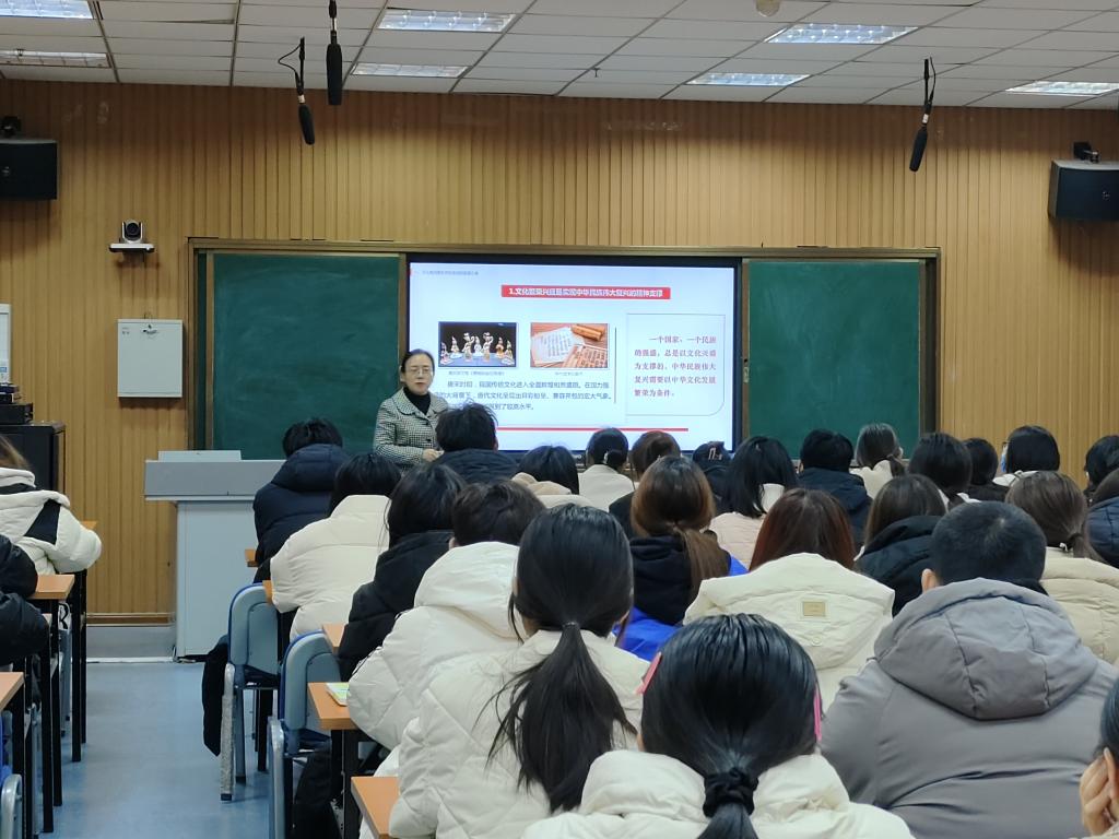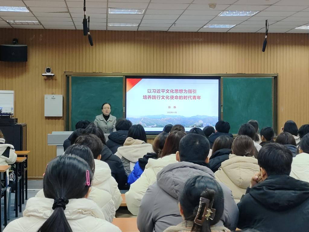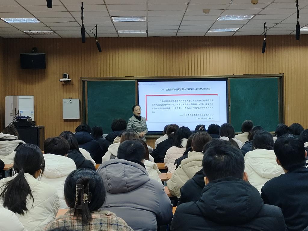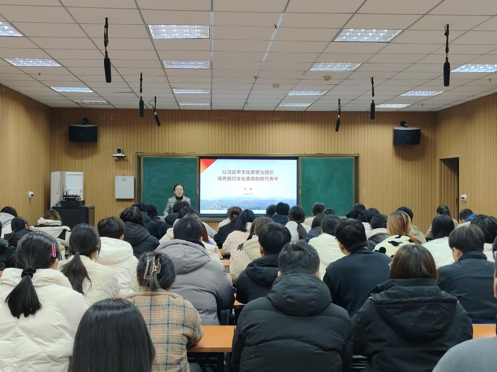 徐静从理论和实践、历史与现实、国内与国际等角度,围绕习近平文化思想的形成过程、丰富内涵对习近平文化思想作了系统宣讲和深入阐释。她结合学校以及学院发展、学生成长实际,对习近平文化思想进行了重点解读。课上她勉励新时代青年学子,深入学习习近平文化思想,树立对马克思主义的信仰、对中国特色社会主义的信念、对中华民族伟大复兴中国梦的信心,要肩负起历史使命,坚定前进信心,立大志、明大德、成大才、担大任,运用马克思主义的立场、观点和方法解决问题,在实践中增强对社会主义的政治和情感认同,自觉践行时代赋予的文化使命。