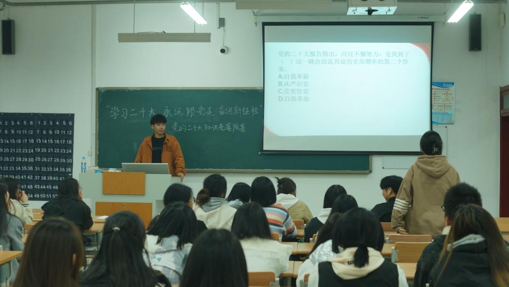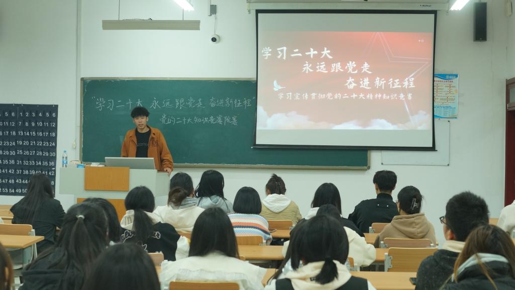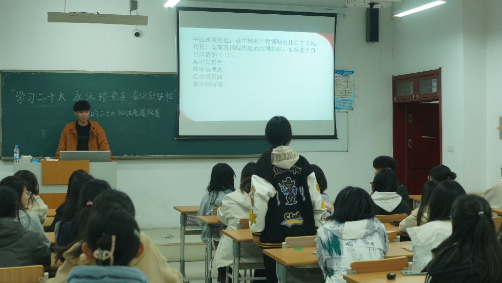 为推动党的二十大精神入脑入心,引导青年大学生坚定树立对马克思主义的信仰、对中国特色社会主义的信念、对中华民族伟大复兴中国梦的信心,11月8日,亚洲精品国产在明理楼0142教室组织开展“学习党的二十大 奋进新征程 永远跟党走”党的二十大精神知识竞赛。