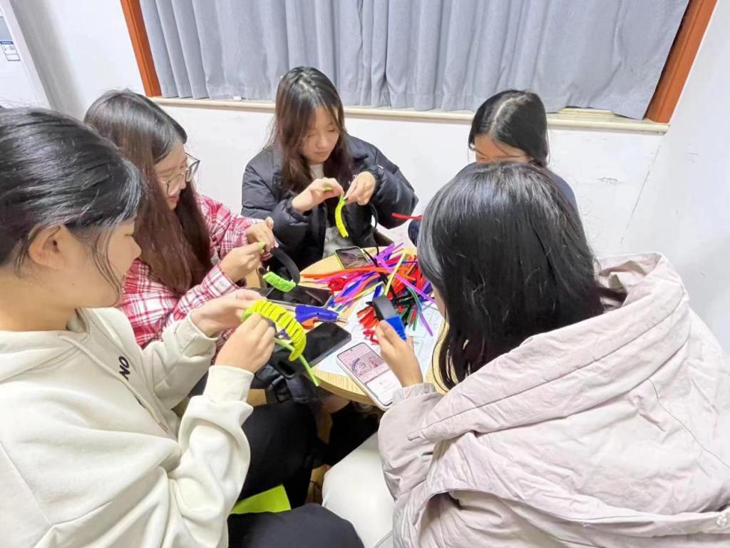 随后,在手工创意坊负责人的示范和讲解下,同学们边看边听边学,让手上的扭扭棒动了起来,一扭一捏、一卷一折,成品的雏形初现眼前,有的同学还在头冠上添加了小蝴蝶结、珠子等装饰品,使得头冠更加生动可爱。一圈圈缠绕的扭扭棒,也将同学们与中国的京剧文化悄然缠绕在一起,在他们心中播撒了京剧文化的种子。制作完成后,大家纷纷展示自己成果,分享制作心得和感受,表示京剧文化博大精深、源远流长,作为新时代青年更要做好传承和发扬,让京剧文化薪火相传、历久弥新。