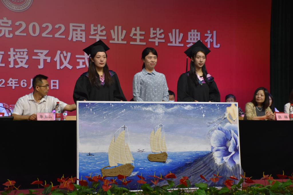 谢观静、董雪两位同学代表毕业生向学院赠送了亲手绘制的作品《星辰大海》,感恩学院老师的悉心教导,祝愿学院再创辉煌成绩。