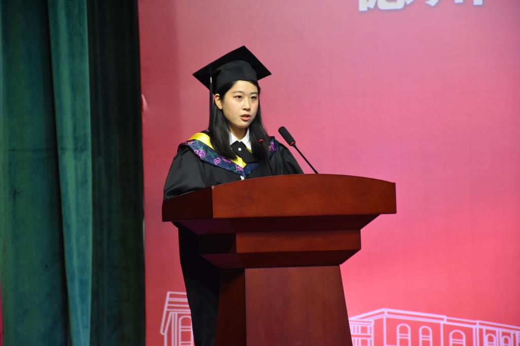 毕业生代表、18级服工1班时欣宇同学深情回顾了大学四年的美好生活,感恩学校、学院和老师的辛勤培养,并满怀信心地憧憬未来。