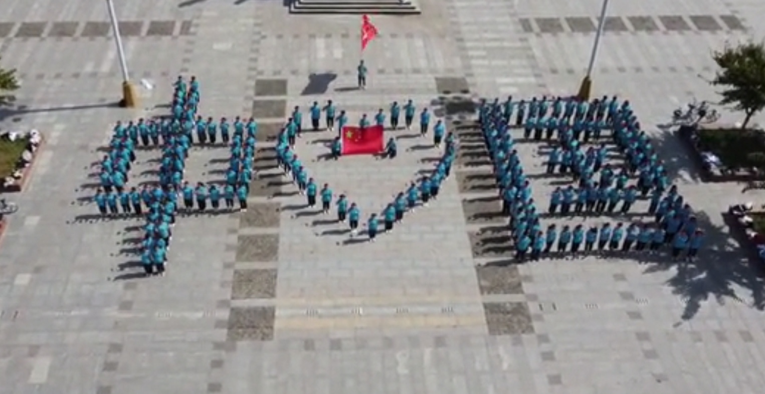 学生们手持五星红旗,将国旗贴在脸上,摆出“中国心”的图案和阵列,并齐唱《歌唱祖国》,表达对祖国的爱,为新中国成立72周年送出祝福。