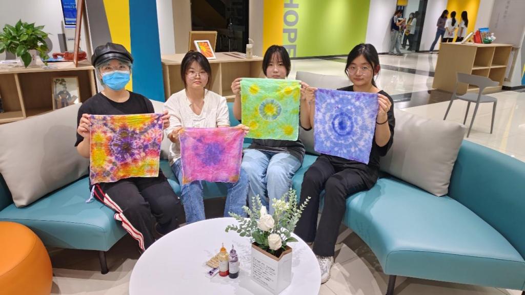 活动现场,主讲人向同学们介绍了扎染的历史渊源及制作流程。扎染作为中国民间传统而独特的染色工艺,有着悠久的历史,其独特的艺术效果和丰富的文化内涵,深深吸引着同学们。在制作过程中,同学们充分发挥想象力和创造力,利用纱线、皮筋、木棍等工具,将一片片白色布料染出了一幅幅色彩斑斓、独具特色的扎染作品。在作品展示过程中,同学们纷纷为自己的作品命名,互相欣赏作品并分享制作方法,在欢声笑语中感受扎染的乐趣与韵味。