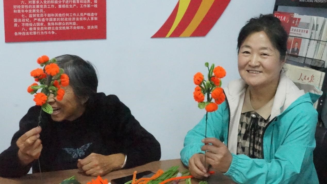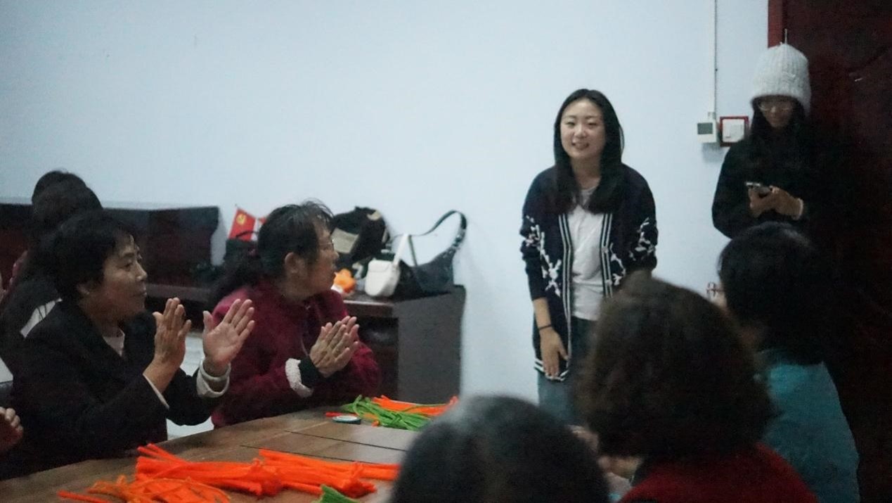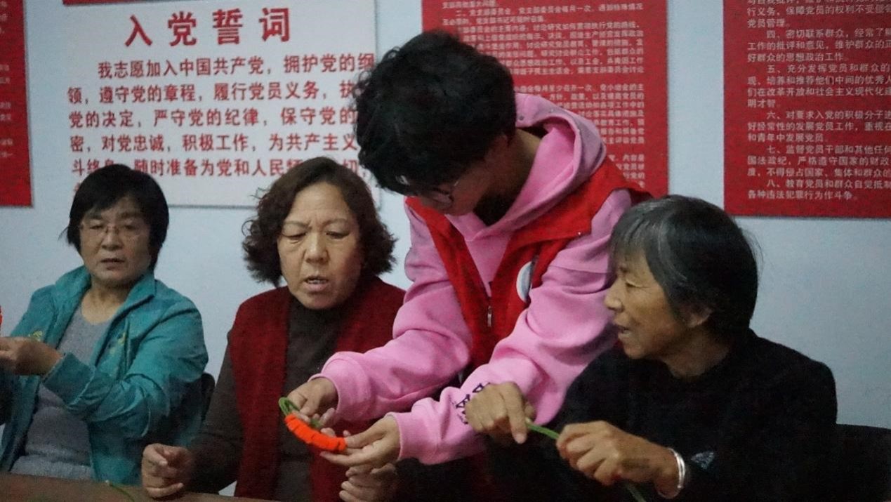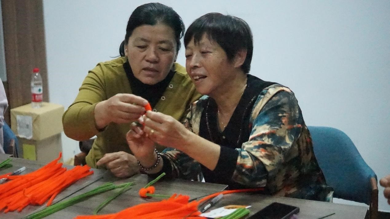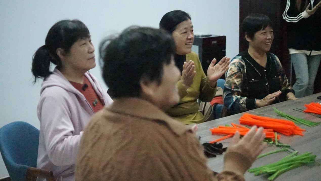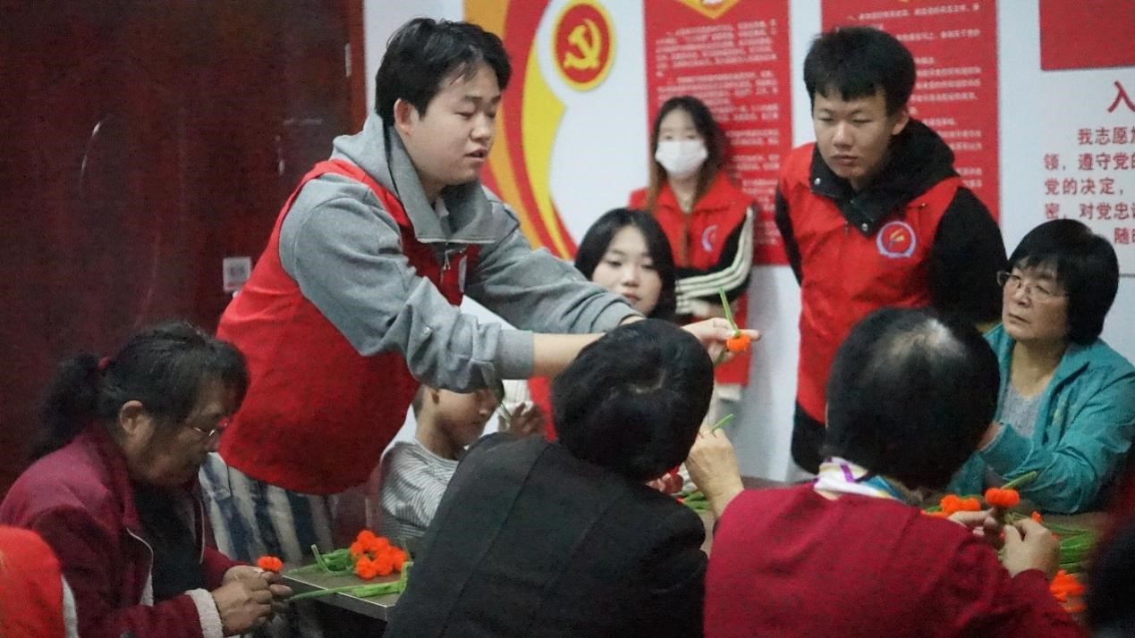 活动伊始,一场生动有趣的“逛三园”游戏,让现场欢声笑语不断,气氛热烈而温馨。随后,在轻松愉快的氛围中,志愿者们开始教社区的老人们用扭扭棒制作南瓜花,他们耐心细致地为老人们讲解制作步骤,手把手地教他们如何操作,老人们也学得兴致勃勃,一边认真听讲,一边动手实践,在学生志愿者们的帮助下,一朵朵栩栩如生的南瓜花逐渐在老人们的手中绽放,他们的脸上洋溢着幸福和自豪的笑容。