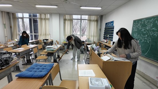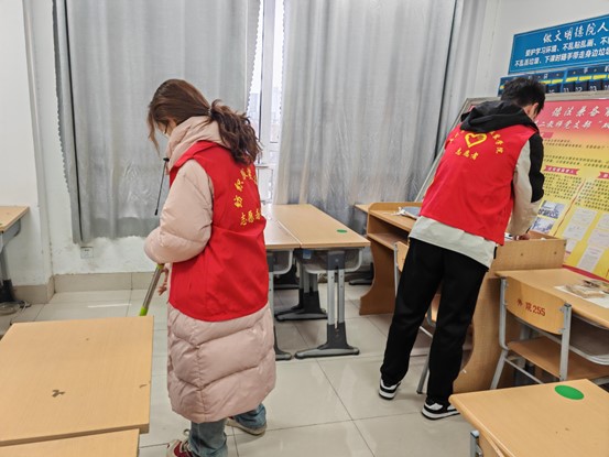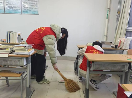 志愿者们手持扫帚、簸箕、铲子等工具,在考研自习室开展卫生清洁志愿服务活动。志愿者们分工明确,配合默契,有条不紊地对自习室的每一个角落进行清理,从桌椅到窗台地面,从黑板讲台到墙角缝隙,无一遗漏。志愿者们积极服务,认真清扫,在他们齐心协力的劳作下,原本略显杂乱的自习室焕然一新,桌椅干净明亮,地面一尘不染。志愿者们用实际行动践行“学习雷锋、奉献他人、提升自己”的志愿服务理念,相信在这样整洁的环境中,考研学子们将更有动力和信心去迎接未来的挑战。
