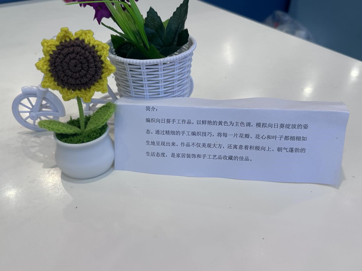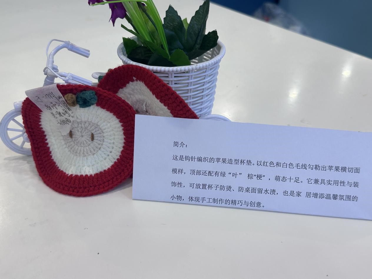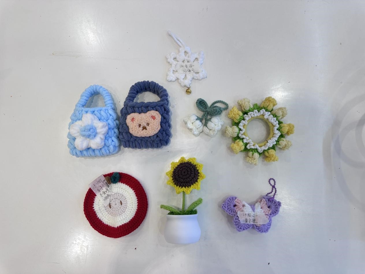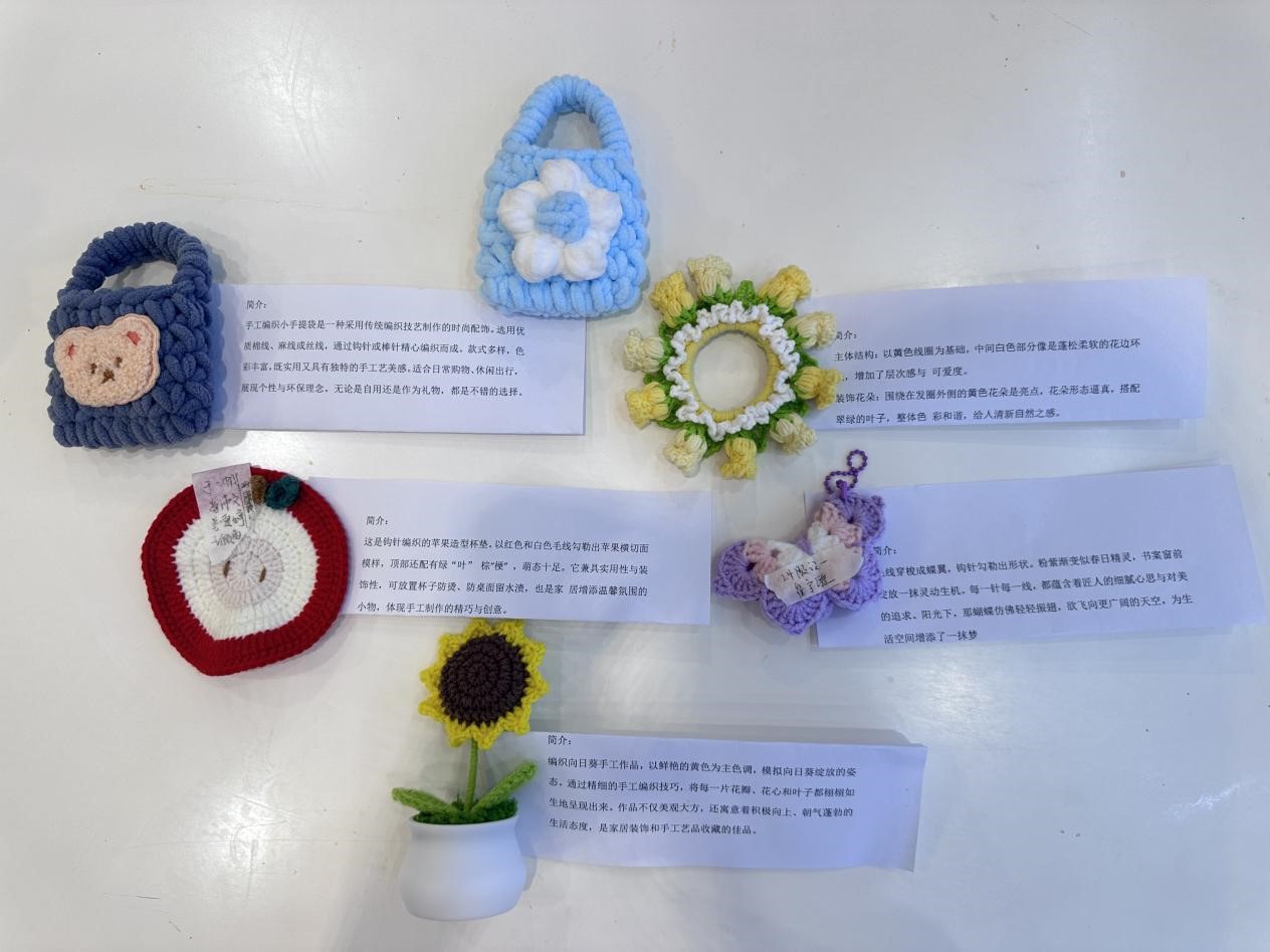 本次活动共分为活动策划、作品创作和成果展示三个流程。活动开展前,活动负责人精心策划,整合基础针法、花样编织等系列视频,给同学们分享线上课程资源,便于同学们随时学习交流。活动期间,同学们以针为笔、以线为墨,在编织、缝制等多元形式中展现巧思,既注重作品细节,又充分释放艺术张力,于经纬交错间实现手工实践与心理调适的双重收获。在作品展示环节,同学们提交的作品种类繁多、各具特色,有憨态可掬的动物玩偶、小巧精致的杯垫、寓意美好的盆栽,还有将校园地标、校徽元素融入的特色挂饰,这些作品体现了艺术与生活的深度融合,通过织物特有的温度与质感展现了当代大学生积极乐观的生活态度。
