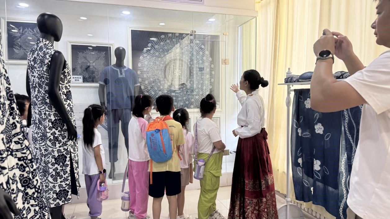 活动伊始,小记者们在学生讲解员带领下,开启纺织文化奇妙之旅。小记者们先后参观了面料展室、齐鲁服饰展室、染缬艺术展室、服装展室、鲁锦展览馆等展厅。小记者们紧紧跟着讲解员,走进各个展室,轻轻触摸各类面料,感受到纺织面料之美。讲解员在面料展室为小记者们详细讲解了各种新型绿色环保材料和功能纱线产品。随后小记者们在染缬展馆看到了由我院师生共同制作的造型精美、工艺精湛的艺术作品,了解到了灰缬、绞缬、夹缬、蜡缬四大类染缬技术,同时还参观了以鲁锦为主题的展馆,在精美的鲁锦制品及民间收藏艺术品中深刻感受到了鲁锦之美。展馆中的展品,不论是多彩的功能性面料织物,还是绚丽的蓝白染缬工艺品,都激发起了小记者们对传统纺织文化的浓厚兴趣,鲁锦柔软舒适花纹斑斓精致,更是让小记者们在开阔眼界的同时感受到纺织文化的别样魅力。