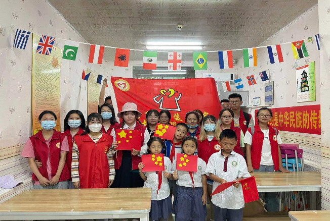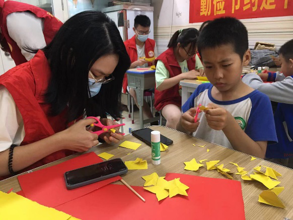 社会实践团队还走进村庄社区、幼儿园开展志愿服务。在社区,社会实践团队积极参加社区防疫消毒等工作,深入当地群众和老党员中开展志愿服务,以实际行动践行了“请党放心,强国有我”的铿锵誓言。在幼儿园,实践团队利用专业优势,手把手指导小朋友制作党旗和国旗的手工作品,小朋友们拿着自己制作的红旗,心情激动,爱国爱党之心油然而生。一面面党旗和国旗在小朋友们手中展现,色彩鲜艳热烈,一如童心,鲜活纯真。