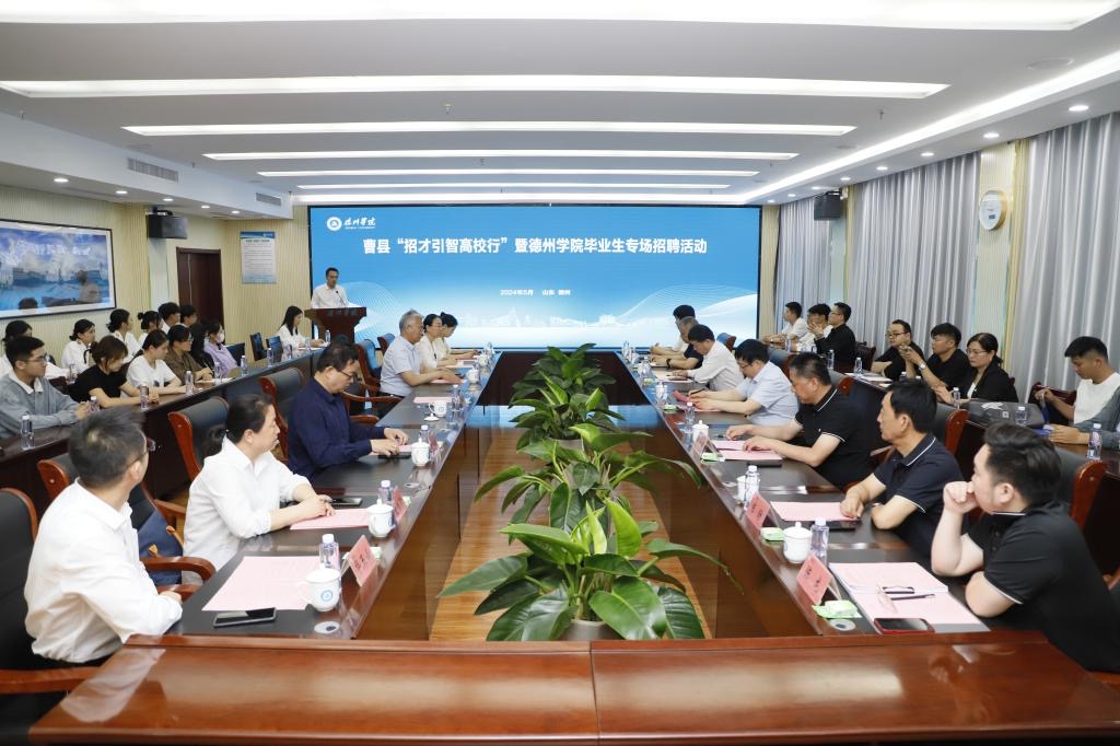 5月15日上午,曹县“招才引智高校行”暨德州学院毕业生专场招聘活动在厚德楼二楼报告厅举行。曹县县委组织部副部长朱文岭,人力资源和社会保障局党组书记、局长赵广民,电商服务中心主任张龙飞,以及曹县12家重点企业负责人参加活动。党委委员、副校长徐静、蒋涛涛出席。